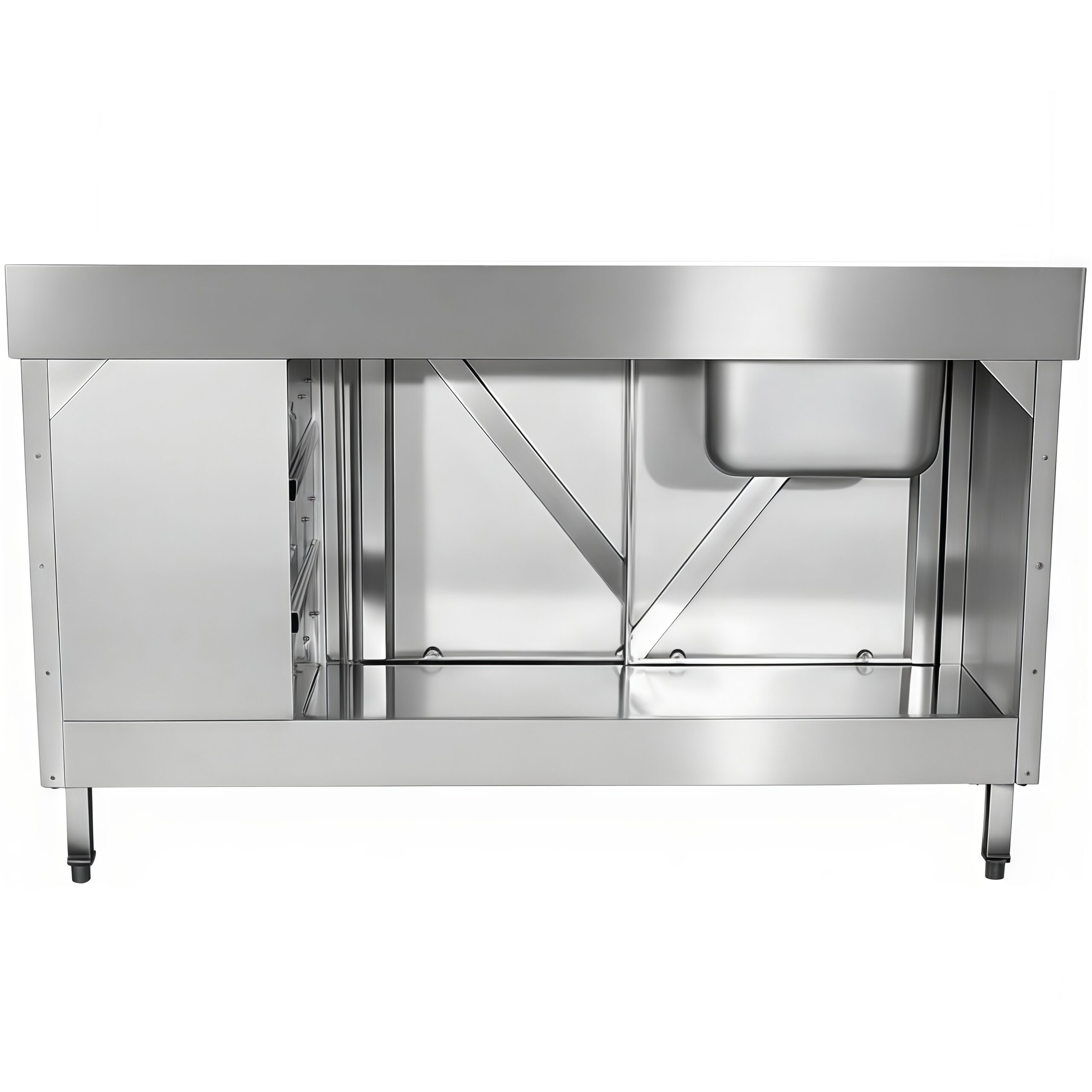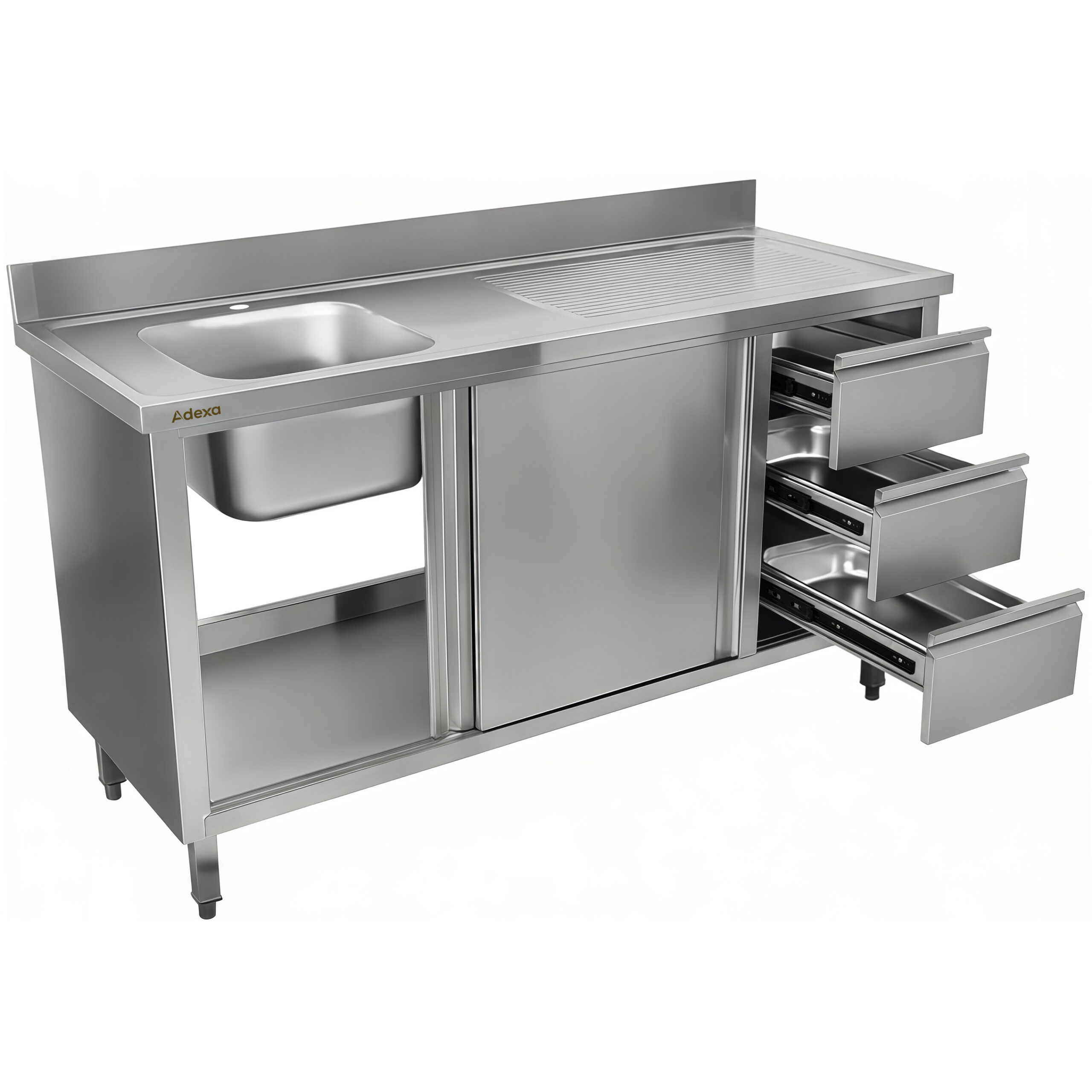 Kaupallinen Ruostumaton Teräs Pesuallas & Säilytysyksikkö: Yksi Allas, 2 Liukuovea ja 3 Laatikkoa Maksimoi tehokkuus ja järjestys kaupallisessa keittiössäsi tällä korkealaatuisella ruostumattomasta teräksestä valmistetulla pesuallas- ja säilytysyhdistelmällä. Suunniteltu optimaaliseen tilankäyttöön ja hygieniaan, tämä yksikkö yhdistää saumattomasti käytännöllisen pesupisteen runsaaseen, helposti saavutettavaan säilytykseen. Tärkeimmät ominaisuudet: Yksi Kaupallinen Pesuallas: Suurikokoinen allas tarjoaa omistetun alueen suurten kattiloiden, pannujen ja astioiden tehokkaaseen pesuun, huuhteluun ja liotukseen. Hygieeninen Ruostumaton Teräs Rakenne: Valmistettu kokonaan kestävästä, catering-laatuisesta ruostumattomasta teräksestä. Tämä ei-huokoinen materiaali on korroosionkestävä, erittäin helppo puhdistaa ja täyttää minkä tahansa ammattimaisen elintarvikepalveluympäristön tiukat hygieniavaatimukset. Tilaa Säästävät Liukuovet: Suuri altaan alapuolinen kaappitila on suojattu kahdella sujuvasti liukuvalla liukuovella. Tämä muotoilu ei vaadi avautumistilaa, mikä tekee siitä ihanteellisen ahtaisiin, vilkkaisiin käytäviin ja maksimoimaan pääsyn irtotavarasäilytykseen (esim. kemikaalit, jäteastiat tai puhdistustarvikkeet). Integroitu Kolmen Laatikon Yksikkö: Sisältää kolme kestävää, täyspitkää laatikkoa pääkaapin vieressä. Nämä tarjoavat osastoituja, pölyttömiä säilytystiloja pienemmille, välttämättömille esineille, kuten aterimille, pakkausmateriaaleille, kokin työkaluille tai valmistelutarvikkeille, pitäen ne helposti saatavilla. Roiskesuoja: Integroitu takayläosa/roiskesuoja suojaa seiniä ja ympäröiviä pintoja vesivahingoilta ja ruokaroiskeilta, varmistaen puhtaamman, hygieenisemmän työtilan. Raskaan Työn Työtaso: Vahvistettu työpinta tarjoaa poikkeuksellista lujuutta ja vakautta, toimien sekä valmistelualueena että omistettuna kuivatuspintana altaan vieressä. Säädettävä Vakavuus: Korkeussäädettävät jalat mahdollistavat yksikön täydellisen tasapainottamisen epätasaisilla lattioilla, varmistaen maksimaalisen vakauden käytön aikana. Täydellinen all-in-one-ratkaisu pesuun ja järjestettyyn säilytykseen kiireisissä ravintoloissa, kahviloissa ja catering-tiloissa. Katso tarkat tiedot kohdasta ’Määrittely’.