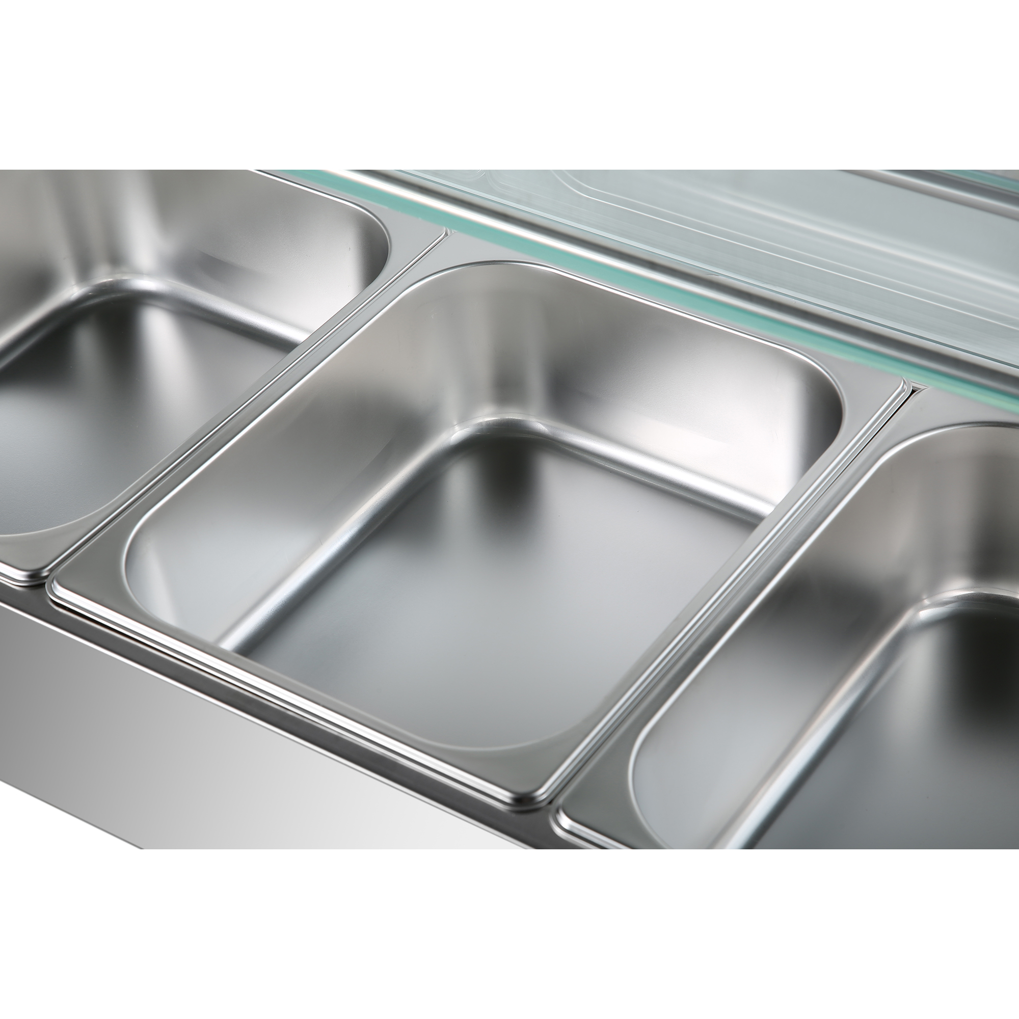 Tämä bain marie -lämmitin pitää ruoan lämpimänä vähäisellä seisonta-ajalla, jotta se voi palvella suuria vierasryhmiä, jotka kiertävät ruokailualueella. Tämä ruokien lämmitin on suunniteltu pöytätasokäyttöön ja se pitää GN1/2-kokoisia astioita. Lämmitin tarjoaa täydellisen aseman kuumien ruokien säilyttämiseen. Laite sisältää jopa lasisen roiskesuojan, joka suojaa ruokaa epäpuhtauksilta ja edistää elintarviketurvallisuutta. Säädettävä lämmönsäätö ja virran merkkivaloKostea lämmitysToimitetaan UK-standardin mukaisella pistokkeellaUpotettu lämmitin veteen lämmitystehokkuuden parantamiseksiRuostumaton teräsrakenneTermostaattiohjaus, kestävä ja vankkaSopii GN-kokoisille ruokapadoille, joiden syvyys on enintään 10 cmKorkean rajan suoja kuivaa lämmitystä vastaanLiukumattomat kumijalatLämmitys- ja virtamerkkivalotKatso tarkat tiedot kohdasta ’Tekniset tiedot’.