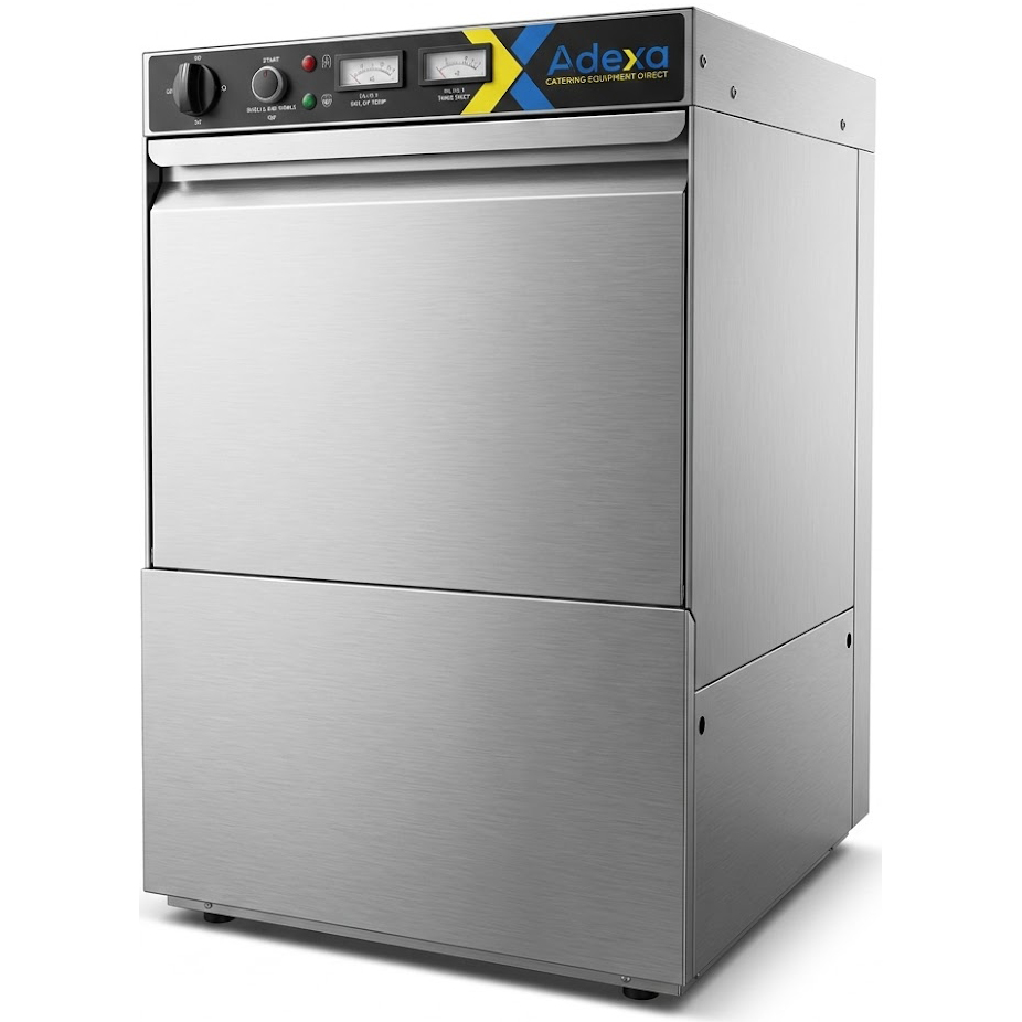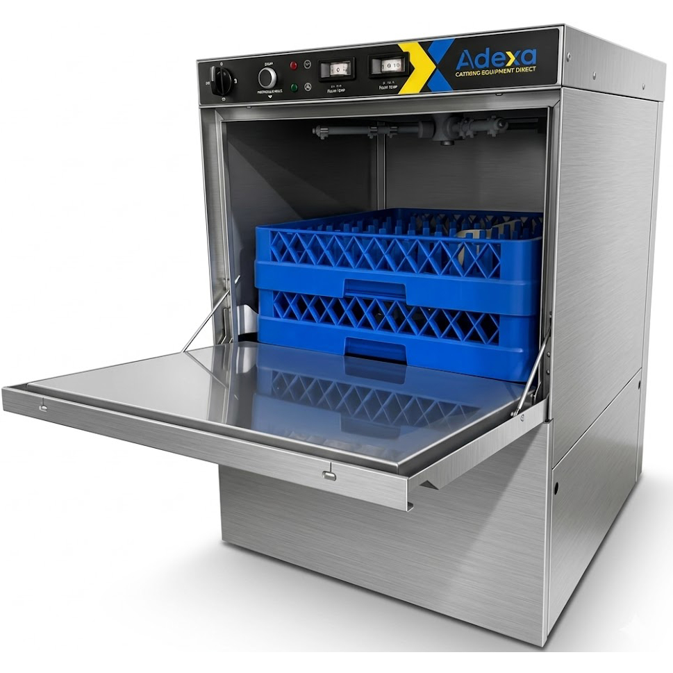 Kaupallinen astianpesukone 500 lautasta/tunti 500mm kori Tyhjennyspumppu Pesuainepumppu Huuhteluainepumppu 230V/1 vaihe | Adexa WZ50DRDP