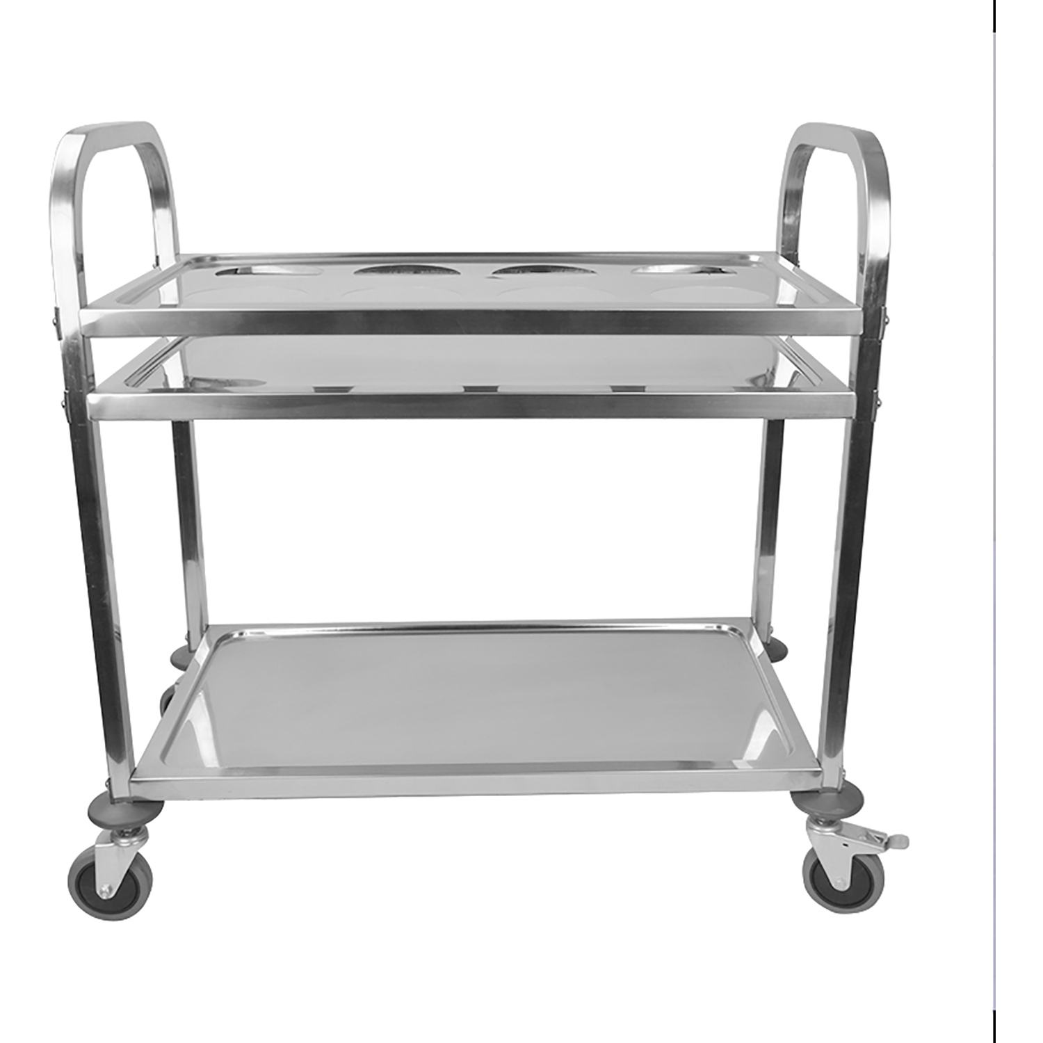 Kestävä ja monipuolinen ruostumattomasta teräksestä valmistettu tarjoiluvaunu. Tämä ammattitason ruostumattomasta teräksestä valmistettu tarjoiluvaunu on ihanteellinen ratkaisu ruoan, astioiden ja tarvikkeiden kuljettamiseen missä tahansa kaupallisessa tai institutionaalisessa ympäristössä. Korkealaatuisesta, korroosionkestävästä ruostumattomasta teräksestä valmistettu vaunu tarjoaa poikkeuksellista kestävyyttä, hygieniaa ja tyylikästä, ammattimaista ulkonäköä. Paranna toimintasi tehokkuutta ja ammattimaisuutta tällä luotettavalla ja tyylikkäällä ruostumattomasta teräksestä valmistetulla tarjoiluvaunulla. Keskeiset ominaisuudet: Vankka rakenne: Premium-laatuisesta ruostumattomasta teräksestä valmistettu vaunu kestää kovakäyttöisyyttä ja on helppo puhdistaa, varmistaen kestävän suorituskyvyn ja hygienian. Sujuva liikkuvuus: Varustettu neljällä kääntyvällä pyörällä, joista kaksi on lukittavia, vaunu liikkuu vaivattomasti eri lattiamateriaaleilla ja tarjoaa erinomaisen hallittavuuden ja vakauden paikoillaan ollessaan. Ergonomiset kahvat: Helppokäyttöiset työntökahvat on suunniteltu mukavaan ja turvalliseen käsittelyyn, jolloin käyttäjän väsymys vähenee. Korotetut reunat: Jokaisessa hyllyssä on korotetut reunat, jotka estävät esineitä liukumasta tai putoamasta kuljetuksen aikana, varmistamalla tavaroidesi turvallisuuden. Monipuoliset käyttökohteet: Täydellinen käytettäväksi ravintoloissa, hotelleissa, sairaaloissa, ruokaloissa, catering-palveluissa ja varastoissa. Pyörät: 4 kääntyvää pyörää (2 jarruilla) Katso tarkemmat tiedot kohdasta ’Tekniset tiedot’.