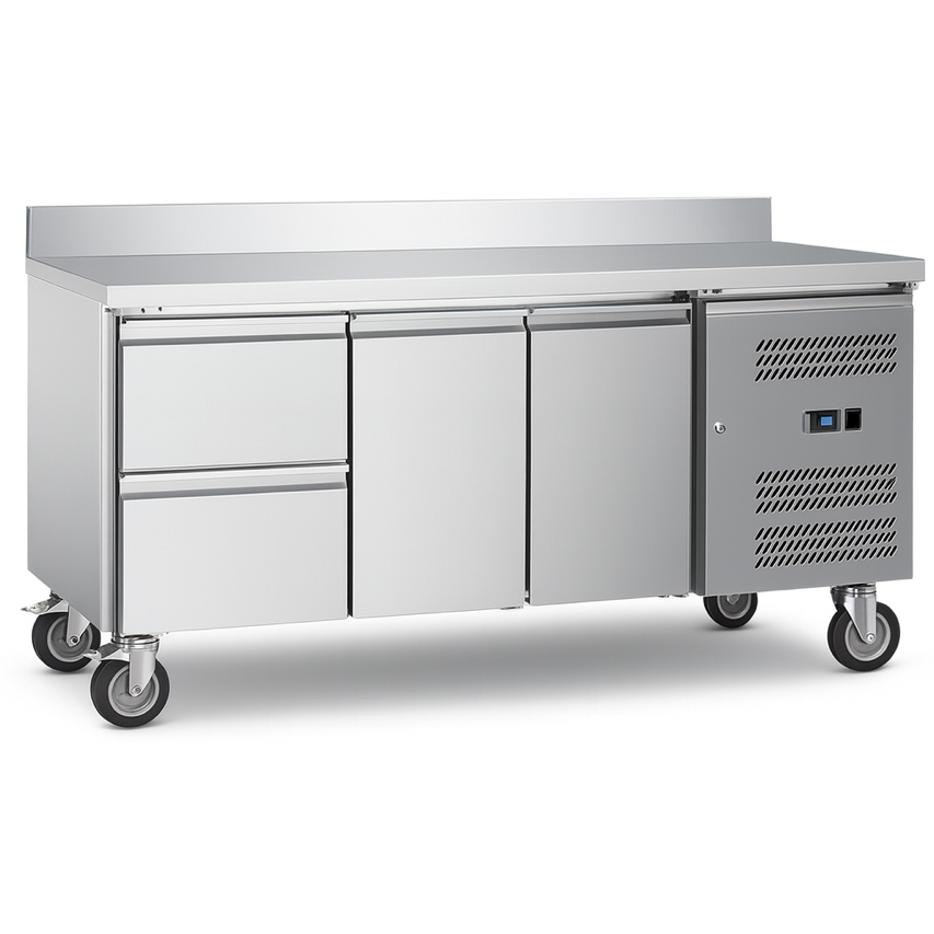 Työtasojääkaappi, jossa on 2 ovea ja 2 GN-laatikkoa sekä 4 pyörää. Tämä ravintolatason jääkaappi tarjoaa useita hyödyllisiä ominaisuuksia, jotka tekevät ravintola- ja ammattikeittiön työskentelystä huomattavasti helpompaa. Lämpötila-alue +2 – +8 °C CFC-vapaa kylmäaine ja vaahto. Täydellinen rakenne sisä- ja ulkopuolella ruostumatonta terästä AISI 304 pyöristetyillä sisäreunoilla helppoa puhdistusta varten. 60 mm eristyskerros. Ilmastointijäähdytysosasto takaa paremman ilmankierron. Automaattinen sulatus ja kondenssiveden automaattinen haihdutus. Elektroninen termostaatti ja digitaalinen LED-lämpötilanäyttö tarkkaa ohjausta ja helppoa lukemista varten. Itse sulkeutuva ovi. Magneettitiiviste voidaan vaihtaa ilman työkaluja. Lämpöelementti piilotettu ovikehykseen kondensaation estämiseksi. Suunniteltu GN1/1-astioiden mitoille. HC-kylmäaine. 4 pyörää mukana. Virransyöttö: 230V / 1N / 50Hz. Vakiona brittiläinen pistoke asennettuna. Asiakirjat. Lataa tästä CE-vaatimustenmukaisuusvakuutus. Katso tarkat tiedot kohdasta ’Määrittely’.