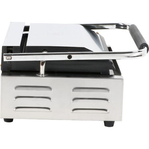 Täysikokoinen kaupallinen kaksiosainen panini-kontaktigrilli, jolla on laaja valikoima ammattimaisia catering-käyttöjä. Täydellinen kontaktigrilli mihin tahansa ammattimaiseen ravintolaan, kahvilaan, baariin, voileipäkauppaan tai hotelliin. Teho: 3,6 kW Ylälevy on itsesäätyvä ja painejousi on säädettävissä, joten voit mukauttaa kypsennyksen ruoalle. Kaksoisvyöhyke Uritettu ylä- ja alalevy Emaloidut levyt Termostaatti 50°C – +300°C Lämpöä kestävät kahvat Merkkivalot Katso tarkemmat tiedot kohdasta ’Tekniset tiedot’.