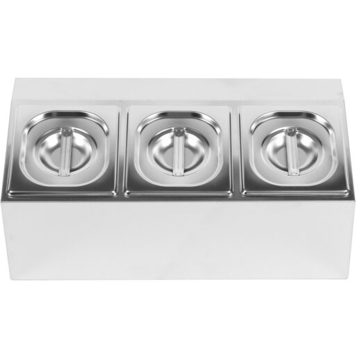 Alkuperäinen hinta oli: 223,97 €.100,78 €Nykyinen hinta on: 100,78 €. (sis. ALV)Kaupallinen mausteteline sisältäen 2xGN1/6-100mm & 1xGN1/3-100mm kannelliset astiat, ruostumatonta terästä | Adexa CHD04B2