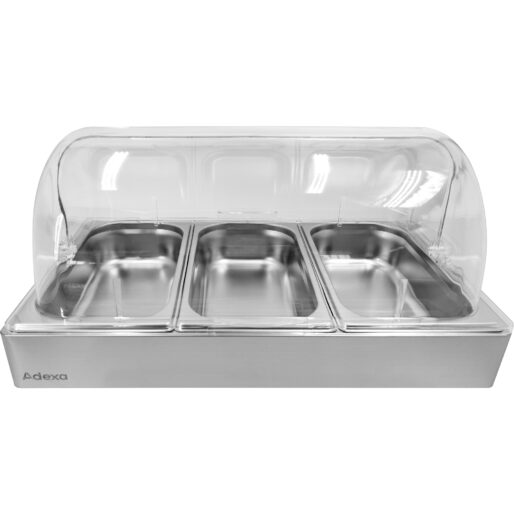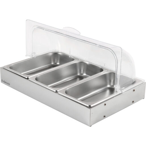 Alkuperäinen hinta oli: 116,23 €.84,85 €Nykyinen hinta on: 84,85 €. (sis. ALV)Kaupallinen mausteteline kannella, sisältäen 3xGN1/6-150mm astiat, ruostumatonta terästä | Adexa CHD03ADFL