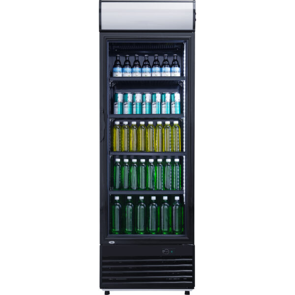 Kaupallinen juomajäähdytin Pystymallinen 332 litraa Staattinen jäähdytys Saranoitu lasiovi Musta Katon valaisin | Adexa LG332BBLACK